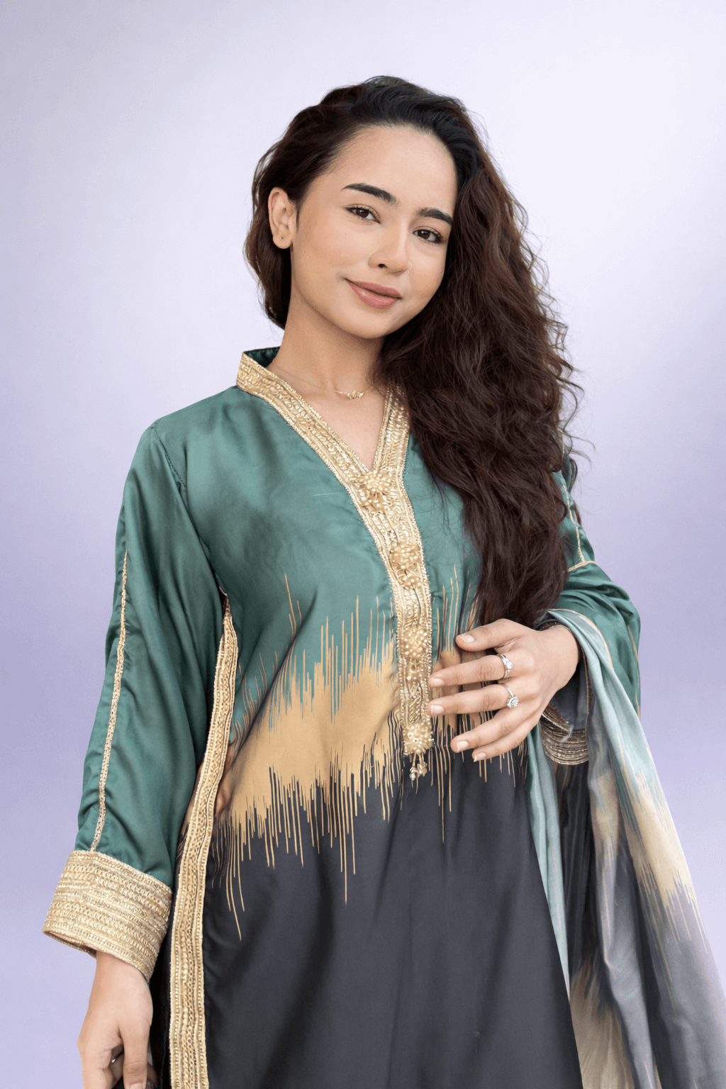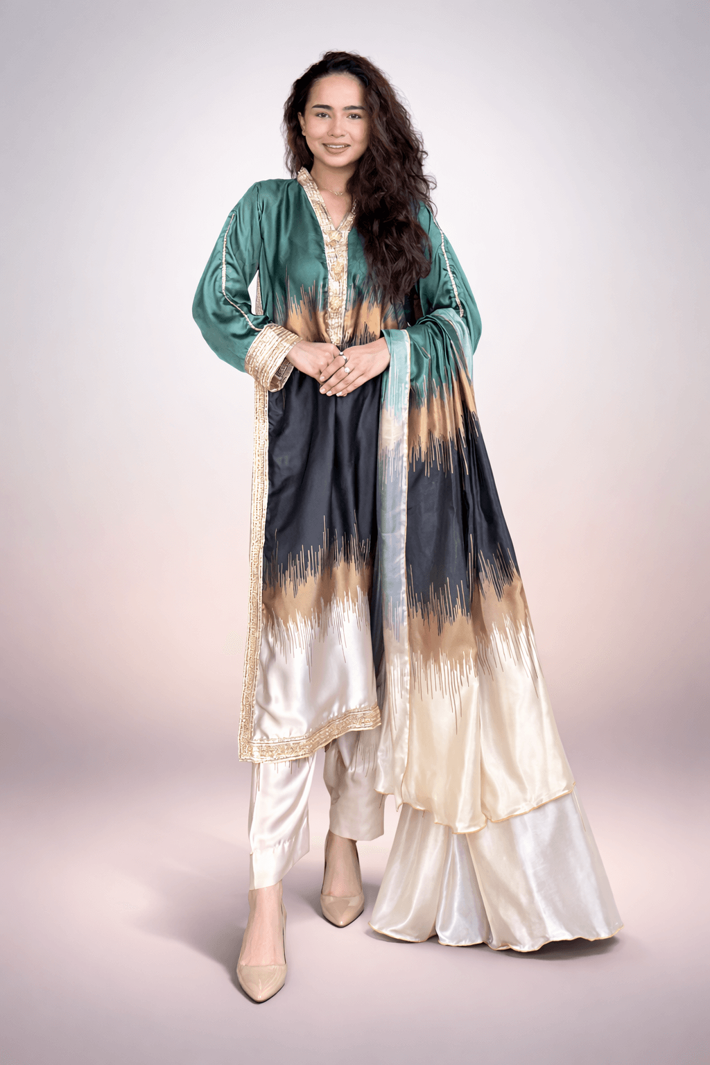 This beautifully stitched suit features a rich dark green shade that blends softly into black and cream tones, creating an ombre effect that feels both modern and graceful. The kurta is enhanced with delicate golden embroidery on the neckline and borders, adding the perfect festive touch without being overdone.