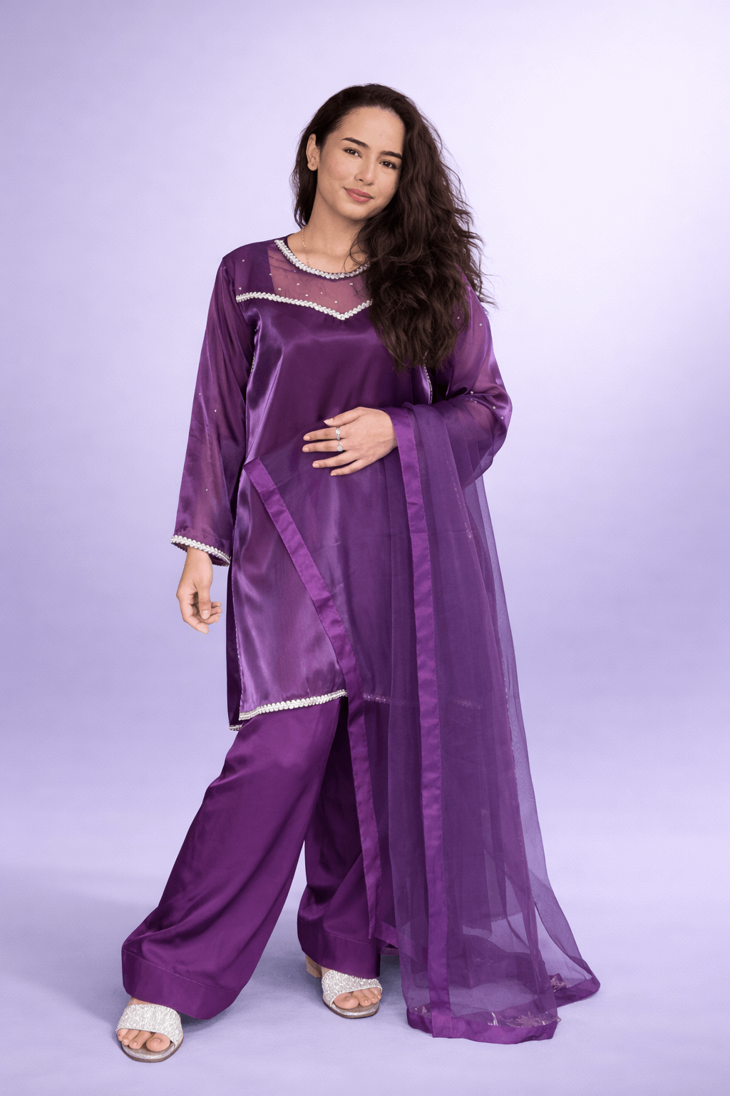 Crafted in soft, lightly shiny silk, this deep plum ensemble offers a graceful silhouette that feels both sophisticated and effortless. The shirt is finished with delicate lace detailing along the neckline, sleeves, and hem, adding a subtle touch of femininity without overpowering the look.